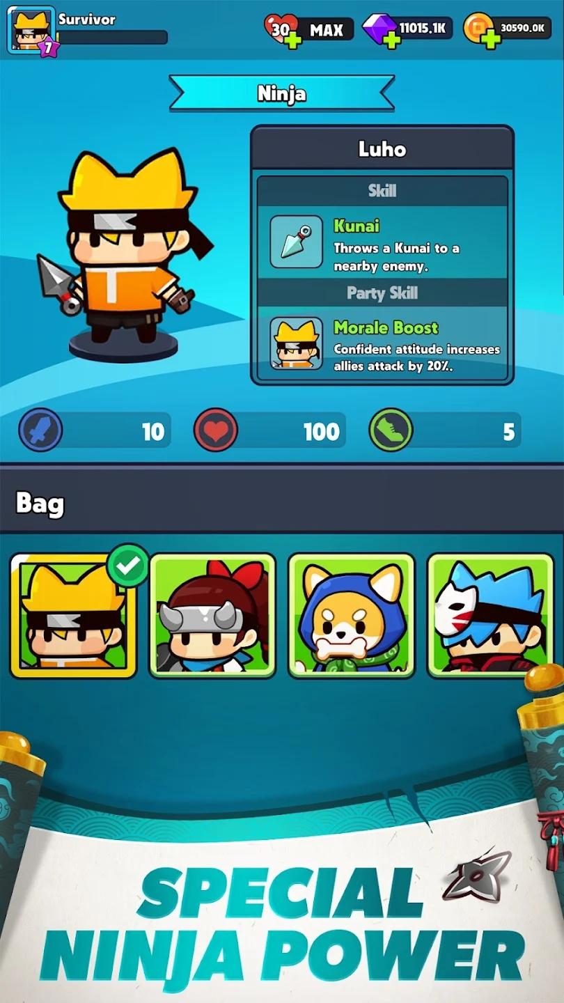 忍者幸存者游戏下载是一款非常紧张刺激的冒险战斗生存游戏,玩家在游戏中可以自由选择自己喜欢的角色,在满是怪物的世界中战斗升级,获取更加强大的装备和技能,消灭周围的怪物生存下去。