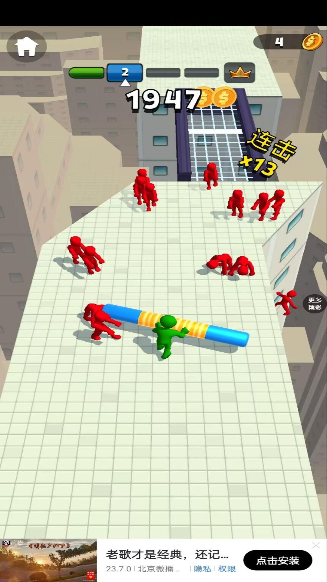 我武器贼牛,抖音热门休闲小游戏。游戏中的场景在楼顶之上,操控你的小人手拿长棍,不断变长,争取将所有敌人推下楼顶,完成你的操作即可过关了。