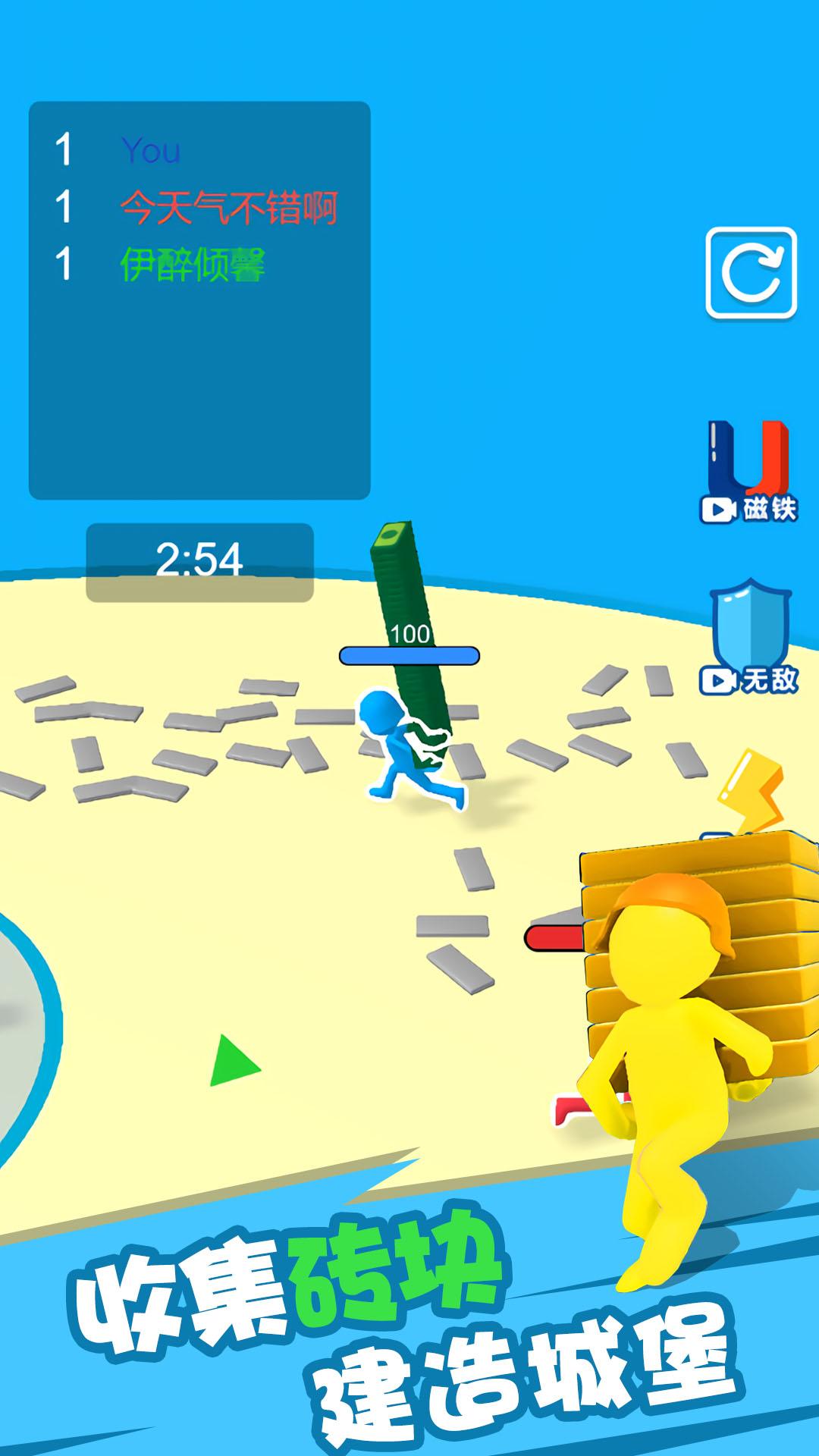 玩家控制人物在地图上不断的收集砖块来升级的自己的城堡,应对危机。