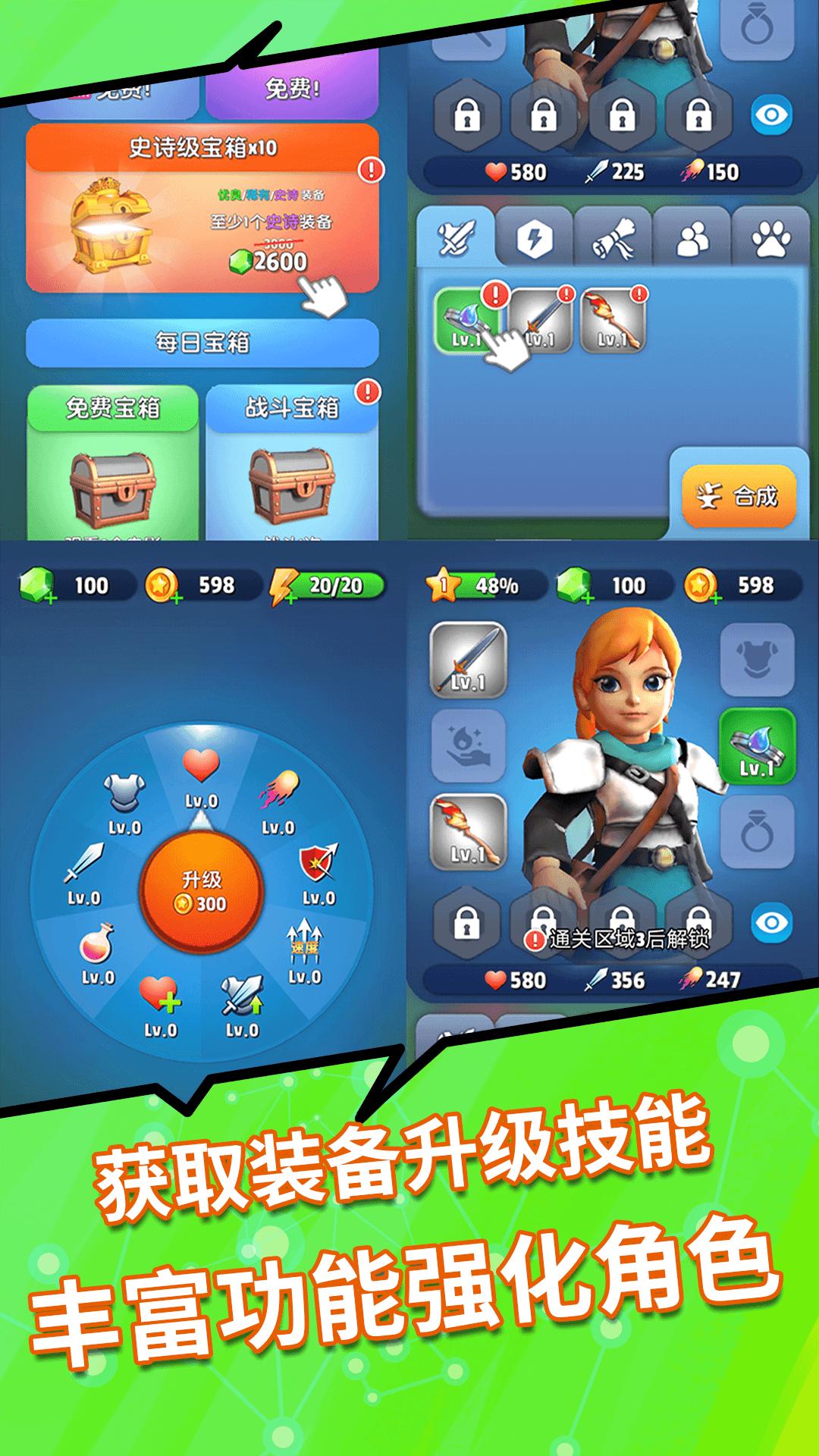 融合独特的升级,获得专属技能,不断挑战更多的敌人,完成挑战;