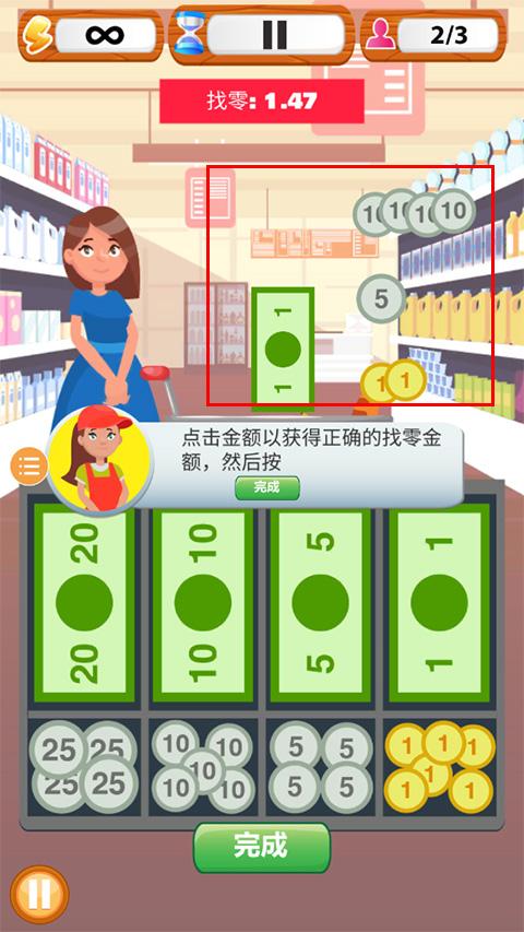 3、通过计算找零并从收银机中获取金币,挑战自己能否顺利完成所有超市收银关卡。