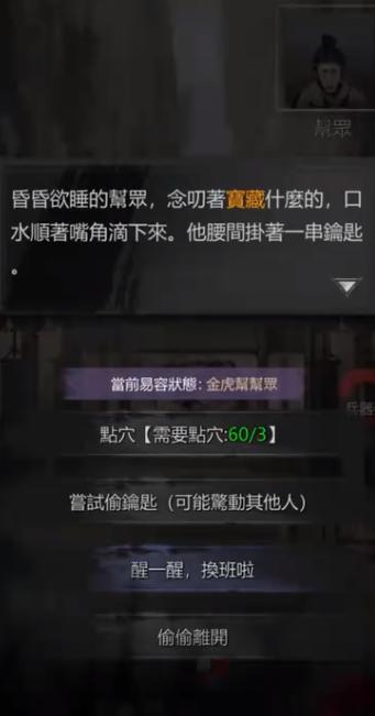 游戏的武侠风很浓,比较亮眼的地方是玩家在地图探索的时候可以使用各种各样丰富的技能,毒术、轻功、易容、机关术、唇语等等等等