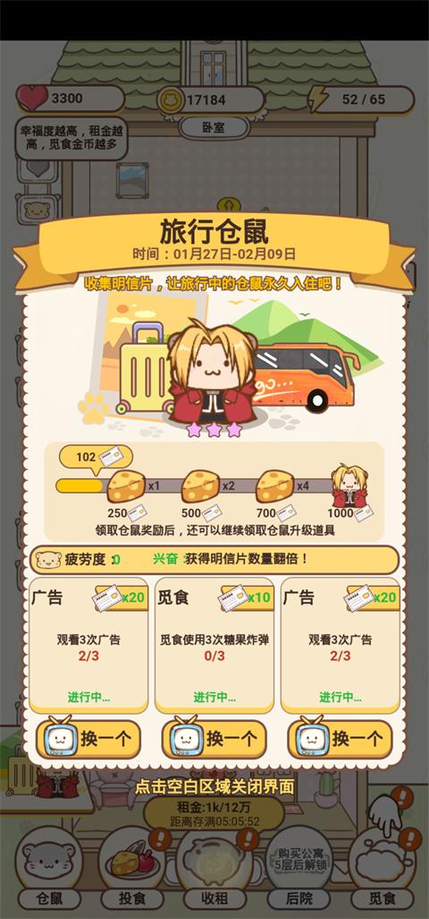 3.奶酪广告随缘点,这条很值,不过十几分钟点一次,有空的时候上线看看小鼠的时候看一下广告领取一下奶酪。奶酪的获取方式不多,除了任务里面,就是从小鼠鼠身上概率获得,然后就是广告,所以,虽然广告比较多,为了抽卡的快乐,还是有必要点一下的。