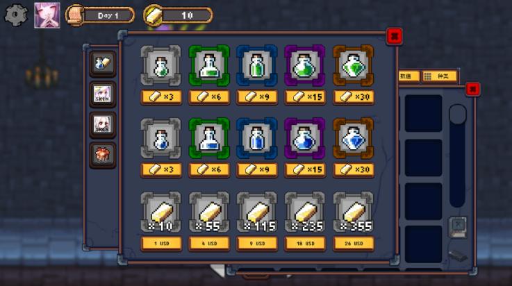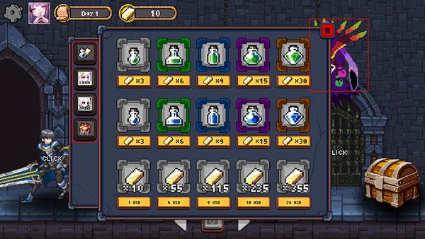 1、进入游戏,点击右上方漂浮魔怪可以购买各种药剂、角色和礼品,相当于商店;
