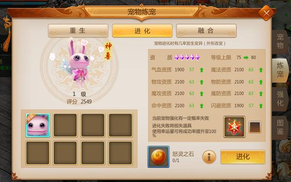2、宠物在25、35、45、55、65级分别可以进化一次,进化有一定成功率。如果在前期没有进化,后期可以进化的总次数不会减少,例如25级时候没有进化,那么在35级时候可以成功进化2次,或者之前一直没有进化,到65级才进化,则可以进化5次。