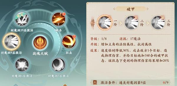 5技能:破甲,速度临时降低30%回合末清除,施加3回合破甲状态受到物理伤害结果增加20%。(2阶,破甲状态额外增加1回合;3阶,破甲状态增伤额外增加10%)