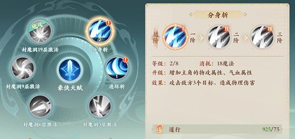 1技能:分身斩,群体3目标。(2阶:增加1目标、3阶:技能伤害结果额外增加10%)