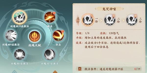 6技能:鬼哭狼嚎(怒气技能消耗120怒气):群体6目标,连续造成3次物理伤害,休息一回合。(2阶:副目标优先气血较少单位、3阶:增加1目标)