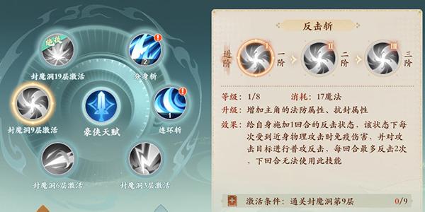 5技能:反击斩,施加1回合反击状态,每次受到近身物理攻击免疫伤害,并普通攻击反击,每回合最多反击2次,技能冷却2回合(2阶:反击次数+1、3阶:技能伤害结果额外增加10%)