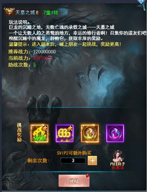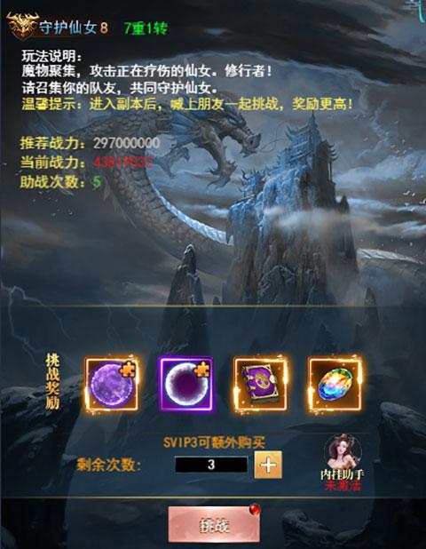 每日试炼副本主要产出培养道具,一共有9个副本,金币副本、天赋副本、唤神副本、仙侣副本、仙宠副本、神武副本、仙翼副本、神装副本、飞剑副本。每次进入副本会扣除一次挑战次数,挑战的层数越高奖励越丰富。挑战次数用完后,可以花费元宝继续扫荡,提高SVIP等级可以增加扫荡次数。每天零点会重置次数。