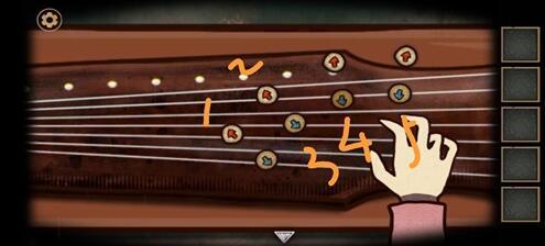 4、点击琴的右侧(琴头小方框)把暗格碎片放入其中,交换位置拼出梅花。把情书和珠钗放入暗格中,给黄衣夫人开门。