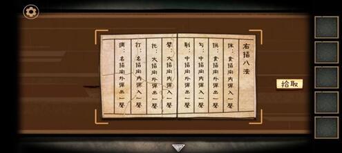 7、用钥匙打开红色柜子,获得?琴弦2。把琴弦放在古琴上修好古琴。在夫人桌上放上《琴谱》拼好残页。