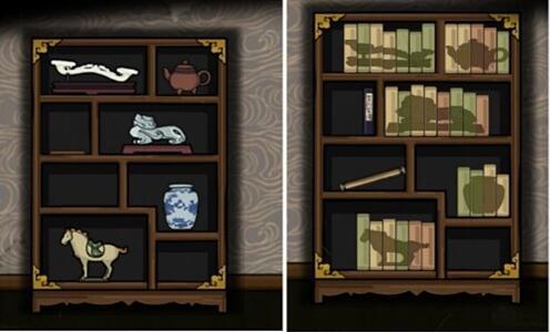2、点击右边书柜拼好柜中5样物品,再根据右边柜子的图案对应左边的柜子中的实物(注:左边柜子必须根据物品的大小移动到合适的格子,和现实中一样要拿起一件东西再放下另一件东西)。