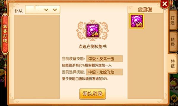 目前皇子只开放中级特技技能,打造装备有概率自带中级特技,使用制造石可以提高自带特技的概率;