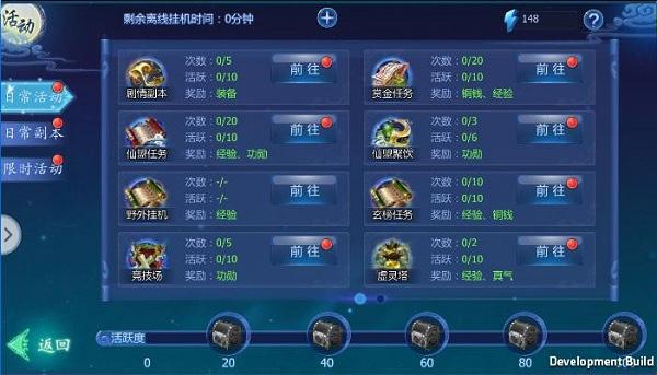 点开活动界面可以参与赏金任务、剧情副本、仙盟任务以及玄榜任务获得海量经验,另外还可以参与小炎界等多人副本以及虚灵塔来获得大量的经验,在日常任务做完后,我们可以到野外对应的挂机场景挂机,也是可以获得不少经验的哦。