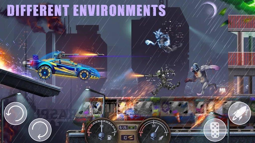 赚取金币,进入车库,用武器和强大的燃料升级你的汽车,对抗僵尸末日。