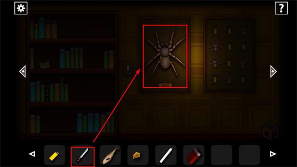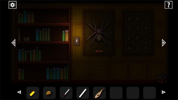 4、点卡冰箱下一层就会发现这里有着巨大无比的血印记,接着向右走,一直来到有局打蜘蛛标本的房间当中,点击书架第三层中间的书可以进行查阅,在上面可以得到密码提示。