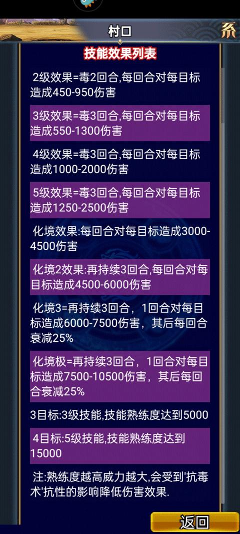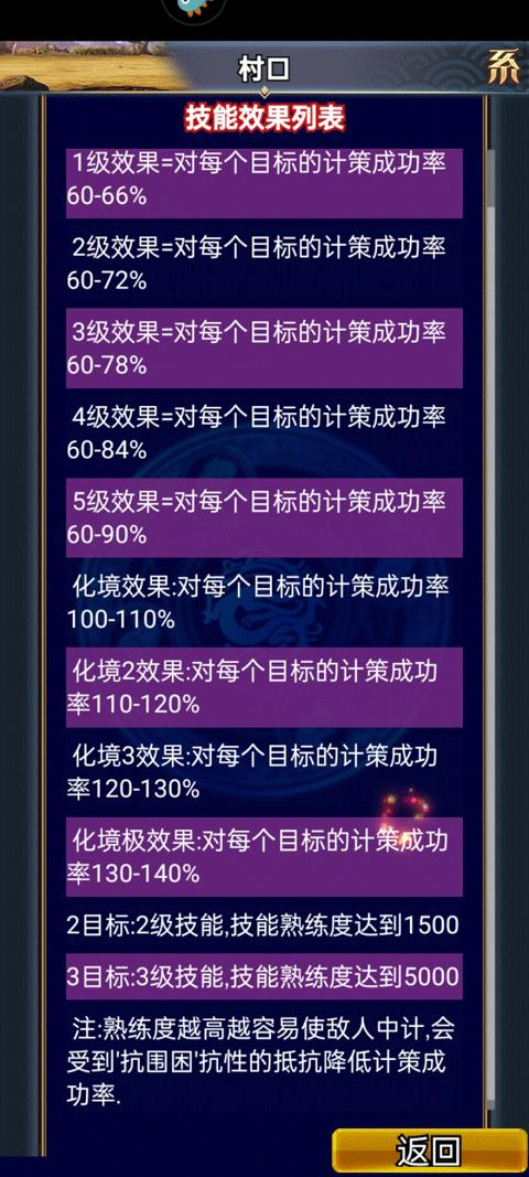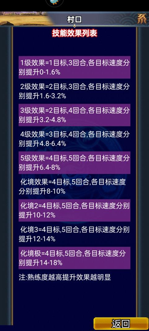 汉风幻想三国OL手游中每个技能共分5级,每级的熟练度上限为6000,熟练度总上限为30000,熟练度越高技能效果越明显。当玩家达到90级并且达到熟练度上限时,则此技能达到化境阶段,技能效果达到巅峰。