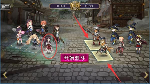 战斗之初可以通过判断分析兵力来判断战力差距,上方布阵左侧为我方兵力也就是总战力刚好过3000多点,而右方则有接近4000战力,战力相差1000只能靠玩家的角色搭配来弥补了。首先说说站位: