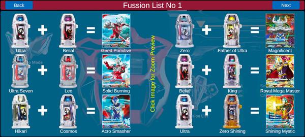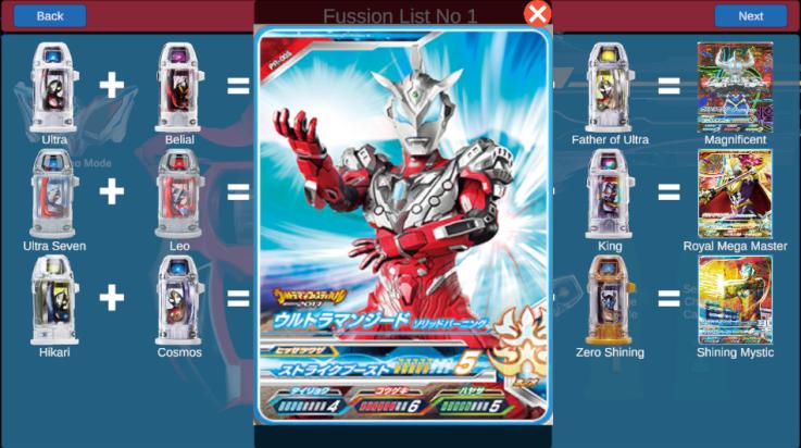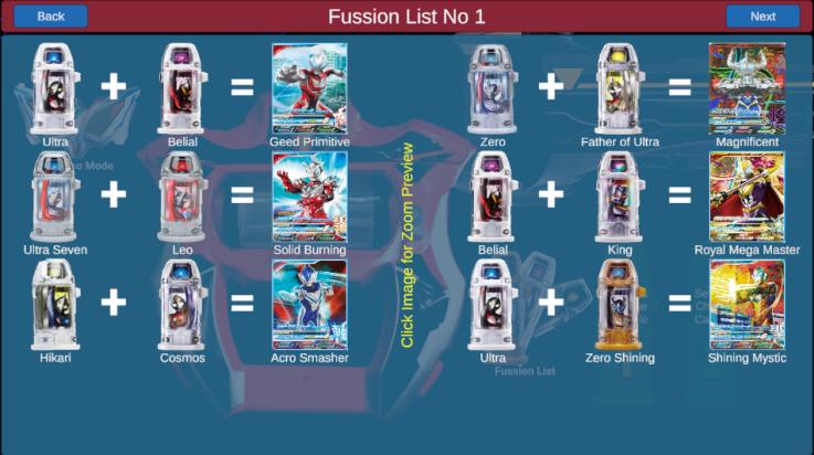 4、点击Fussion List,可以查看不同胶囊能合成什么奥特曼;