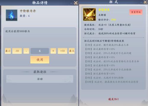 技能招式同样也是有等级进阶,招式达到10级就会解锁一阶特殊效果;那么问题来了,如何升级招式呢,除了每天挂机产生的修为外,还想快速升级的话,那就得谈到平时道友们冲关卡打boss掉落的修为丹了(有急需的小伙伴在商场也可以买到哦),也不必担心前期把修为拿来培养了低品质的招式,我们的招式系统是可以免费重置等级的哦,可以放心去培养升级。下图例就给大家看看。