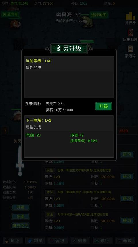 4、玩家通过进入剑灵界面可以给剑灵进行升级,提高剑灵等级,增加剑灵的伤害。