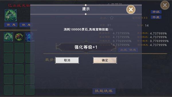5、每种灵宠都有独特的技能,玩家在宠物达到五级时可以对其技能进行洗练升级,增加额外属性,提升战力,技能增加的属性只在战斗中生效。