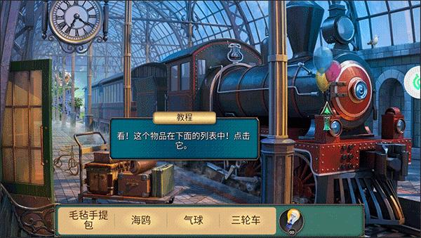 5、按照下方的物品提示找到图中所在位置,这些物品分别是毛毡手提包、海鸥、气球、三轮车,也可以点击灯泡来获得有限的提示;