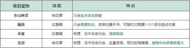 上古四大神兽:东山神灵(青龙),疆良(白虎),朱雀,玄武。会使用天生技能神龙罩或如意圈,普通攻击技能,五系二阶法术技能和四阶法术技能(带降魔斩、修罗术),通常在第1回合及无状态时拉圈/罩子,若星君倒地,优先给星君恢复约50%血量,伤害、速度、防御随挑战层数逐渐提高。