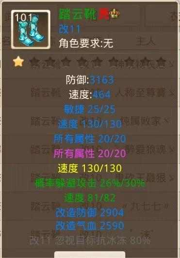 防具鞋子:所有属性+速度+敏捷、粉黄所有属性/速度+敏捷、绿概率躲避攻击。
