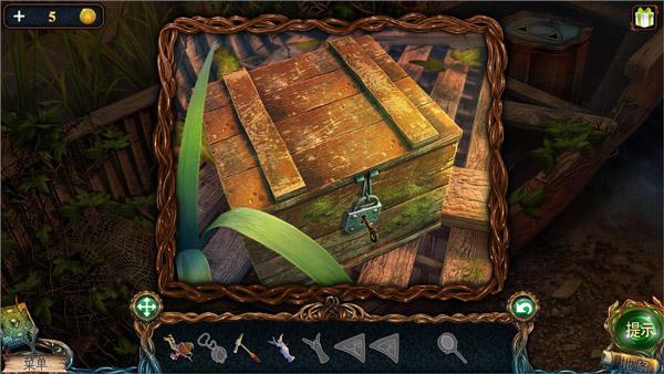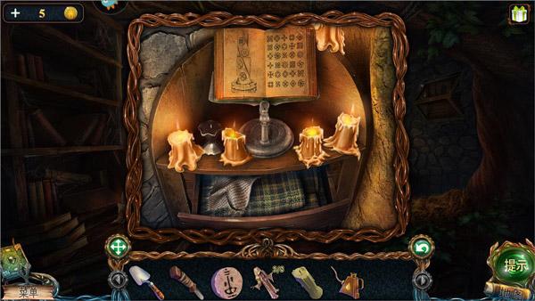 5、小屋内,图中1柜子处获得未点燃的蜡烛,点击阅读蜡烛旁边的书籍得到美人鱼和生命之湖的线索,然后再次点击书籍,提示“这里”有密码;打开柜子抽屉,点击布料获得油壶;