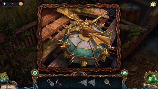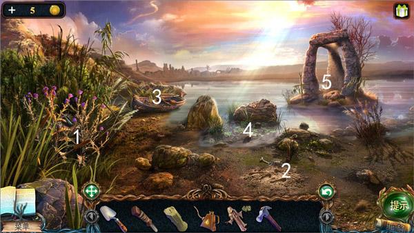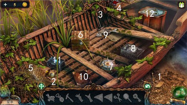 10、点击图中3小船,1处获得获得龙塑像,2处获得钥匙,4处完成拼图获得剪刀,对5使用剪刀获得天使雕塑。