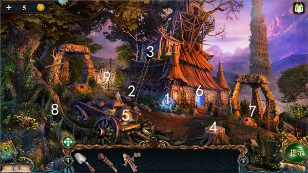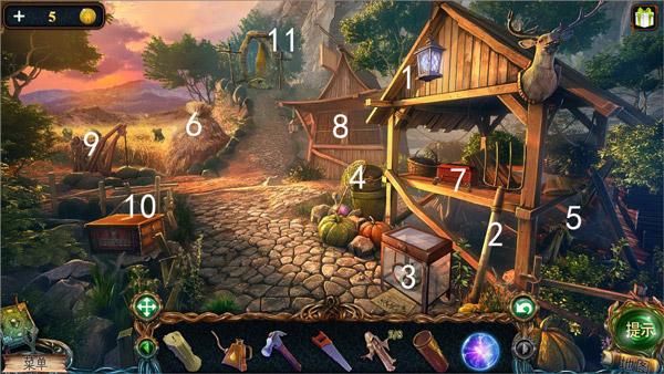 9、图中1处使用镰刀,获得第五块和尚雕塑;2处获得钥匙,再用铲子挖开土,得获得音乐盒鼓。