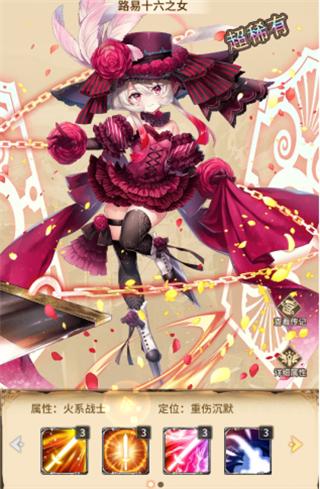 夏洛特,职业火系战士上阵该英雄后有重伤、沉默等效果,该英雄有4个技能,2个被动技能和2个主动技能,等级达到100级后均可激活所有技能。