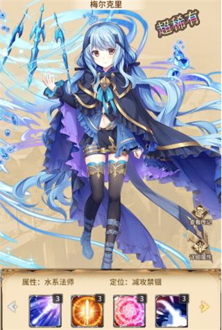 梅尔克里,职业水系法师上阵该英雄后有减攻、紧固等效果,该英雄有4个技能,2个被动技能和2个主动技能,等级达到100级后均可激活所有技能。