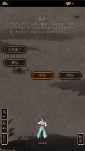 3、接着可以进入地图,点击不同的地方会有解析,比如驿路,你走在一条尘土飞扬的大驿道上,不时的有几匹快马从身边飞驰而过,马上的骑手的背上都佩带着刀枪剑戟,看来都是些习武的人士,道路两旁是树林;