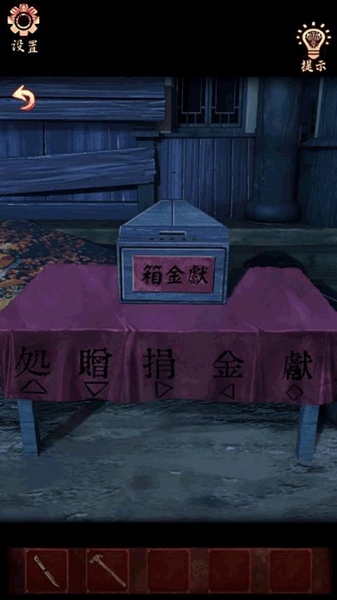 7、点击桌子上的捐赠箱,根据桌布上的图案顺序(正三角形、倒三角形、右三角形、左三角形、菱形),结合告示牌上的线索(右三角形-抚、倒三角形-四、左三角形-起、正三角形-酒、菱形-霸),调整密码锁为:酒四抚起霸