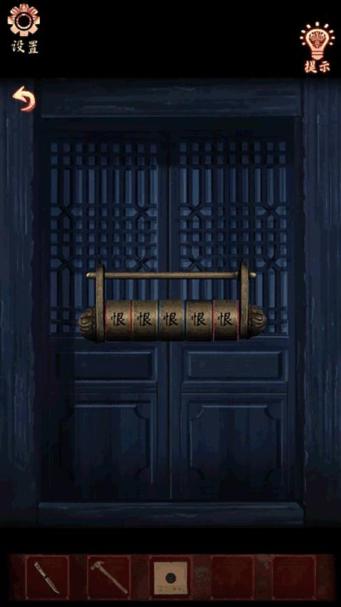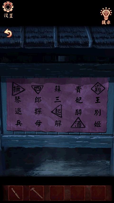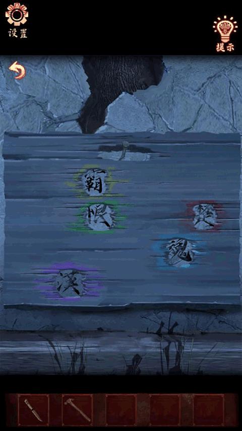 5、点击墙上的字,放上【带孔木板】,获得线索(霸-黄色、恨-绿色、楚-红色、魂-蓝色、漢-绿色)