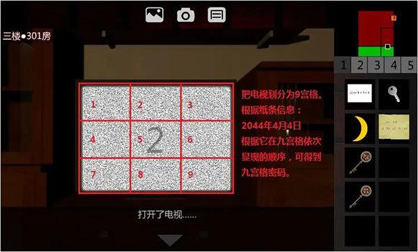 6、回到3F•301房间,右转,用【遥控器】打开电视。(拖拽遥控器于电视上)观察到纸条上“2044年4月4日”这串信息,依次在各个位置显现,它可能暗示了密码。把电视划分为9宫格,把显现的顺序记下来,顺序则为591274638(固定)。