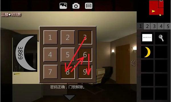 8、解开密码器,进入1F•厨房。右转2次、点击窗户、翻窗,进入1F•游泳池。右转,点击密码器,这是九宫格密码器,容易联想到电视机的字出现顺序。输入密码591274638(固定),取走【临时门禁卡】。回到1F•电梯间。
