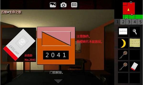 9、点击5F,进入5F•西侧廊,触发剧情,丹跑向了5F•生命之歌。后退,点击密码器。囿于我们没有什么密码,只有观察【临时门禁卡】时,注意到有反着的No.2041。放入2个【碎片】(注意颜色),输入2041,果然解锁。进入5F•经理室。