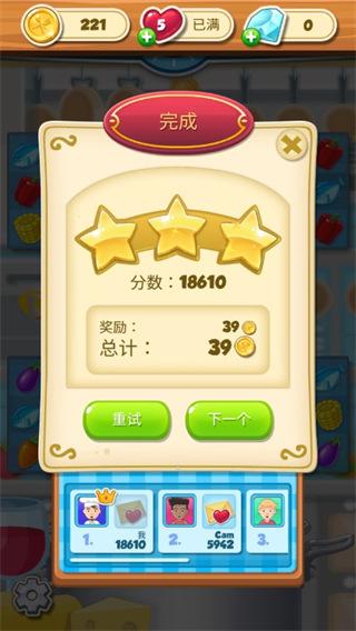 3、在游戏中玩家们要注意获得更多的得分是需要我们使用最少的移动步骤来通关的,这样我们每次就可以顺利地获得非常多的加成,玩家们还要注意,我们餐厅的等级也会影响到加成的。
