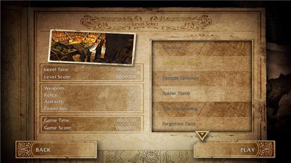 Relics(遗物):2/2(共2件)(注释:游戏中,关于Relics的介绍有这样一段英文“A relic's power will only by granted when the relic power meter is full.”,意思是在游戏中,你只有不断将劳拉随身的一件有“龙头图案花纹”的“战争之剑”的能量值打满后,一直打到“龙头图案花纹”闪耀后。劳拉将拥有无限的火力-武器载弹量“蓝色载弹值”会自动回满,当然之后,你不能让劳拉被攻击到,否则就会失去这个能力。)