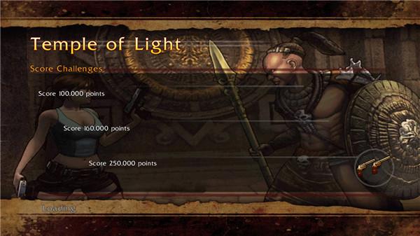 Challenges本关的挑战:(注释:游戏中,关于Challenges的介绍有这样一段英文“A relic's power will only by granted when the relic power meter is full.”,意思是在游戏中,你只有不断将劳拉随身的一件有“龙头图案花纹”的“战争之剑”的能量值打满后,一直打到“龙头图案花纹”闪耀后。劳拉将拥有无限的火力-武器载弹量“蓝色载弹值”会自动回满,当然之后,你不能让劳拉被攻击到,否则就会失去这个能力。在游戏中,按下360手柄的“<”键调出道具菜单,在菜单中,按360手柄的LB或RB键,切换到OBJECTIVES“任务清单”界面下,可以找到在各关中依次解锁出的装备。完成各关中的不同难易度的游戏任务后,方可解锁相应的装备。)