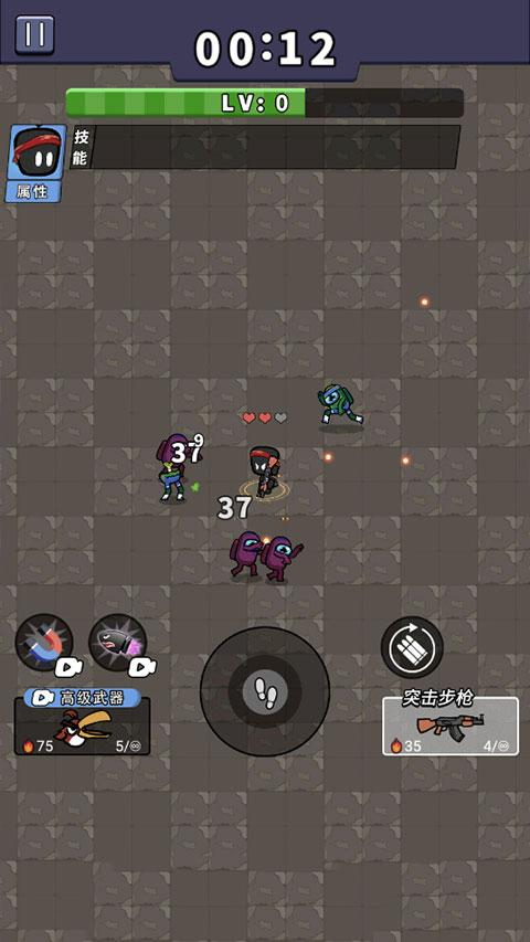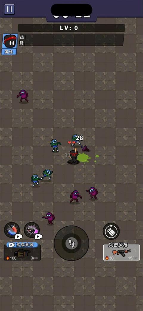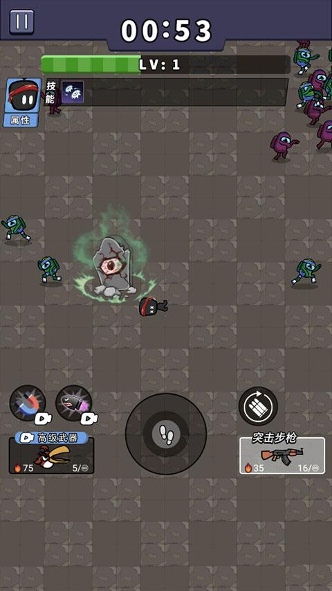 3、滑动中心按钮躲避敌人的攻击,与他们保持一定的距离,英雄会自动射击、自动刷新子弹;
