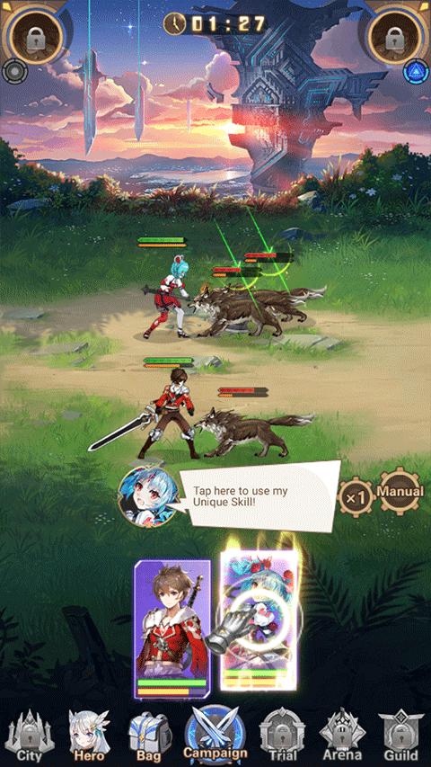 3、战斗开始后会自动开始战斗,每个英雄都有专属技能,点击英雄卡牌即可使用