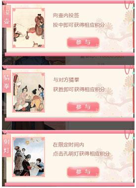 猜拳,投壶跟射灯灯,其中猜拳是无法预估的,小编曾经就试过全部输。投壶跟射灯灯是看你反应的,其中投壶分为三个壶,两个大的一个小的,大的插进去十分,小的二十分,所以我们假如选尽量选小的瓶子,这样你假如全中的话就有60分。还有就是射灯灯,射灯对反应迅速的人没有压力,假如全都点到了,也差不多有50分,但是我们得注意别点到有鞭炮的灯,还有一些两分的灯也尽量能把握住。所以综合所述,假如对自己有信心的,可以选择投壶,假如选择保险的就选择点天灯,当然你假如想跟系统玩闹的,可以选择猜拳。