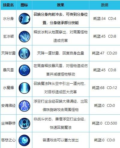 解析:这个搭配是默认的搭配,适合远程猥琐输出,平A虽然能将怪打硬直,但是技能衔接上时间太长,所以还是会被怪物近身,因此需要水分身进行瞬间移动,当快要被近身的那一刻释放水分身,当水分身靠近屏幕边缘的时候迅速再次按下,就能够瞬移到水分身所在的位置,然后继续输出。而玄冰破用于被怪物近身后的逃脱技能之一,玄冰破虽然是输出技能,但是释放瞬间能将怪物击倒,能够迅速脱身。其实前期并不推荐使用唐僧作为主角色进行战斗,主要原因就是水魔爆太难用了,很多情况下根本打不准。在后期解锁安魂佛经就直接替换掉水魔爆吧。