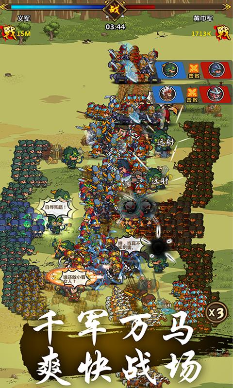 1.1000VS1000大规模同屏混战,战斗过程实时演算。开创手游最恢弘刺激的即时战役。 2.清新画风勾勒精致人物,生动特效丰富细节呈现,逗趣激昂,演绎别样战场风貌。 3.25名武将同时上场,排兵布阵挑战策略极限;战中技能实时操控,全员AI智战争锋。 真实还原出最为激烈的战役,千人同屏对战,史诗级战役一触即发,经典的历史战争,充满刺激的对局战斗,化身主公统帅大军,用你的勇敢和谋略统一天下吧!游戏不光有刺激的多人战役对抗还有有趣的主城模拟和武将养成等诸多可玩性很高的玩法,喜欢的小伙伴就亲自来到游戏中自由摸索吧。小小军团合战三国游戏特色: