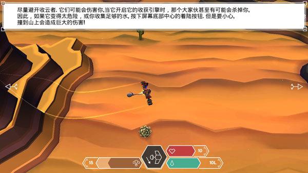 尽量避开收云者,它们可能会伤害你,当它开启它的收获引擎时,那个大家伙甚至有可能会杀掉你,因此,如果它变得太危险,或你收集足够的水,按下屏幕底部中心的着陆按钮,但是要小心,撞到山上会造成巨大的伤害。